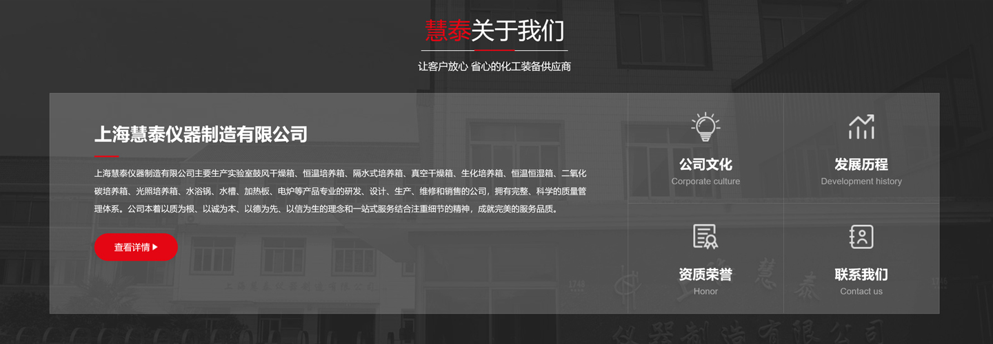 上海慧泰儀器制造有限公司主要生產(chǎn)實(shí)驗(yàn)室鼓風(fēng)干燥箱、恒溫培養(yǎng)箱、隔水式培養(yǎng)箱、真空干燥箱、生化培養(yǎng)箱、恒溫恒濕箱、二氧化碳培養(yǎng)箱、光照培養(yǎng)箱、水浴鍋、水槽、加熱板、電爐等產(chǎn)品專業(yè)的研發(fā)、設(shè)計(jì)、生產(chǎn)、維修和銷售的公司,擁有完整、科學(xué)的質(zhì)量管理體系。公司本著以質(zhì)為根、以誠為本、以德為先、以信為生的理念和一站式服務(wù)結(jié)合注重細(xì)節(jié)的精神,成就完美的服務(wù)品質(zhì)。